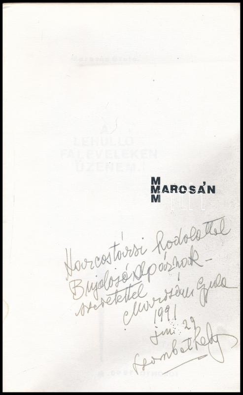 Marosán Gyula: A lehulló faleveleken üzenem. A szerző, Marosán Gyula (1915-2003) magyar-kanadai festőművész, szobrász, grafikus művész, költő által Bujdosó Alpár (1935-2021) költő, mérnök, a Magyar Műhely szerkesztője a magyar avantgarde kiemelkedő alakja részére DEDIKÁLT példány. Toronto, 1990, Szerzői. Kiadói papírkötés, foltos borítóval.