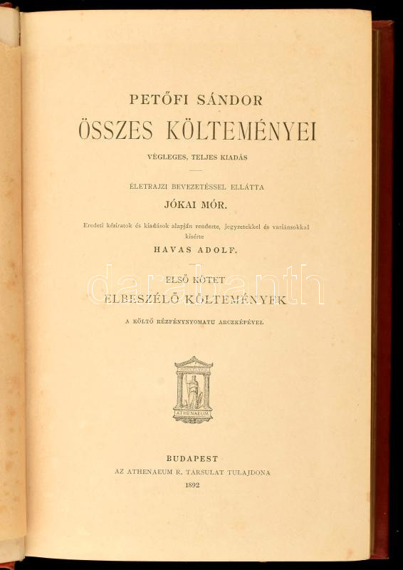 PetÅ‘fi Sándor összes költeményei I. köt.: ElbeszélÅ‘ költemények. Jókai Mór életrajzi bevezetésével. Eredeti kéziratok és kiadások alapján rendezte, jegyzetekkel és variánsokkal kÃsérte Havas Adolf. Bp., 1892, Athenaeum. PetÅ‘fi arcképével. Kiadói aranyozott, festett egészvászon-kötés, Gottermayer-kötés, aranyozott lapélekkel, kopott borÃtóval, foltos cÃmképpel.