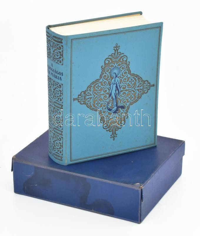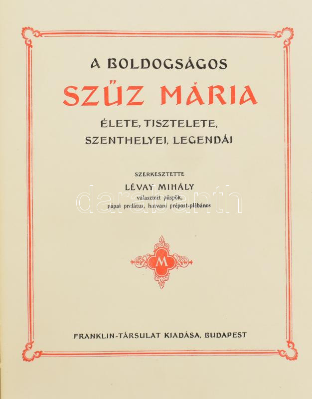 A boldogságos Szűz Mária élete, tisztelete, szenthelyei, legendái. Szerk.: Lévay Mihály. A könyvdíszeket és a könyv kötését Surányi István tervezete és rajzolta. Bp., [1934], Franklin, 511 p. +18 t. Eredeti, 1935-ös számlával. Kiadói dúsan aranyozott, festett egészvászon-kötésben, sérült papír védőborítóban, kiadói védődobozban, kissé kopott, kissé foltos borítóval és védődobozzal.