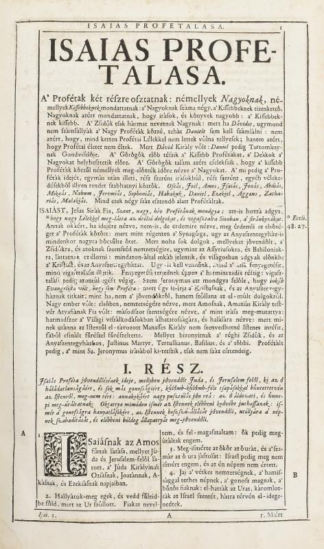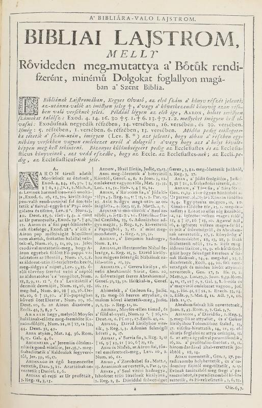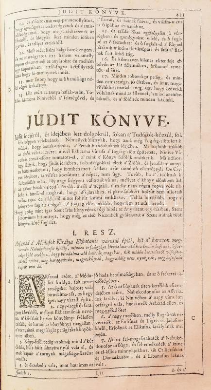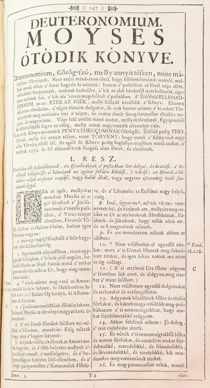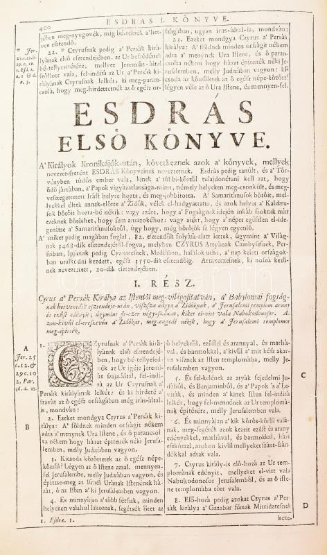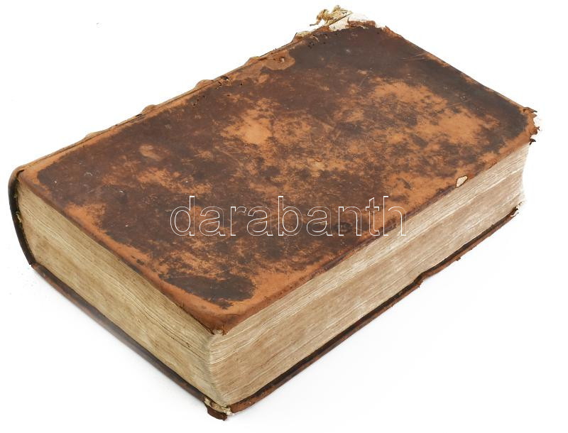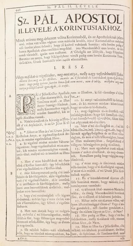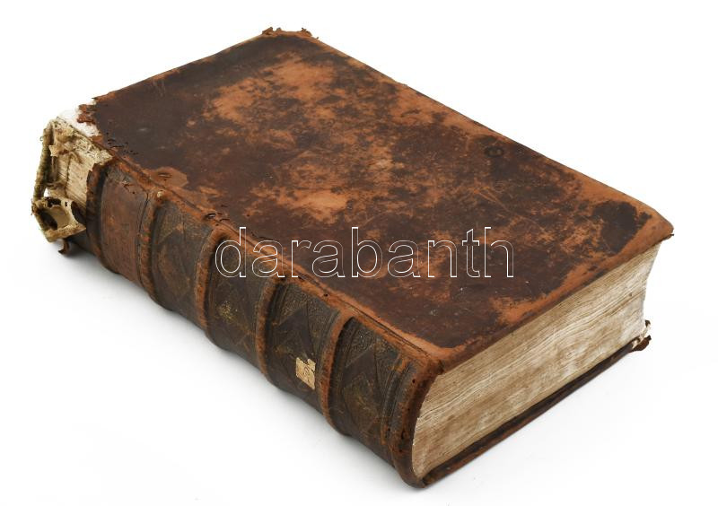 Szent Biblia, mellyet az egész keresztyénségben be-vött régi deák bötűből magyarra fordította a Jésus-alatt vitézkedő társaság-béli nagy-szombati Káldi György pap. [Nagyszombat, 1732., Academiai bötűkkel Berger Leopold,] 7-636+562 p.+15 sztl. lev. Fametszetű záródíszekkel. Második kiadás. Korabeli bordázott gerincű egészbőr-kötés, kopott borítóval, sérült gerinccel, a díszcímlap és az első lapok hiányoznak a 7 oldalig, az elülső szennylap hiányzik,a 7/8. oldal lapja laza, foltos lapokkal, a hátsó szennylap és a hátsó kötéstáblán a lap kissé sérült, néhány bejegyzéssel, régi gyűjteményi címkével, és ex libris bejegyzéssel.