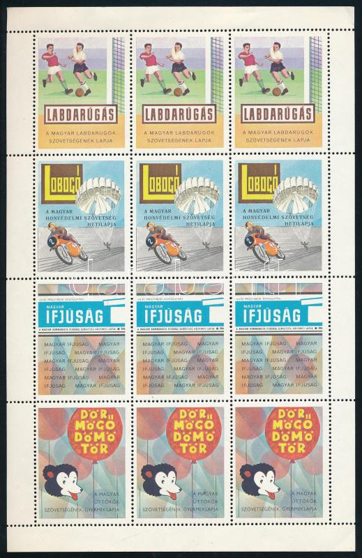 ~1962 Újságokat reklámozó levélzárók teljes ívben (Labdarúgás, Lobogó, Magyar Ifjúság és Dörmögő Dömötör"