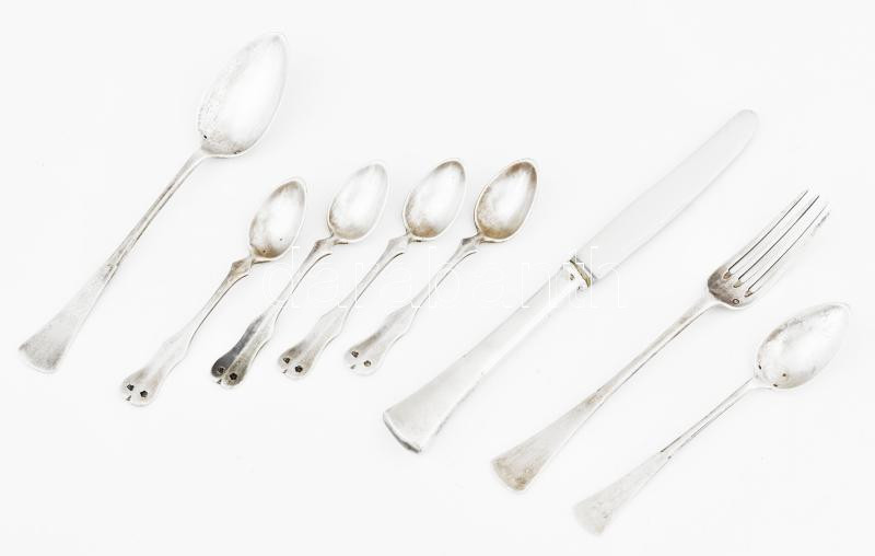 8 darab ezüst (Ag) evőeszköz, közte a kés ezüst (Ag) nyelű, bruttó: 17...
