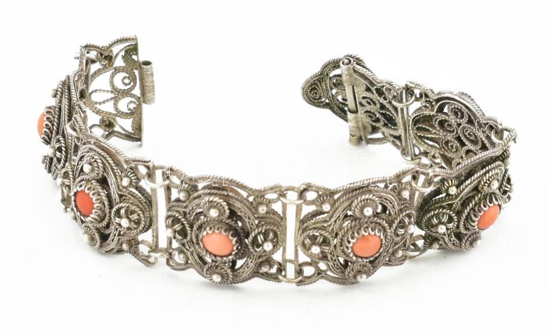 Ezüst (Ag) filigrán karkötő, csiszolt korall berakásokkal díszítve. Je...