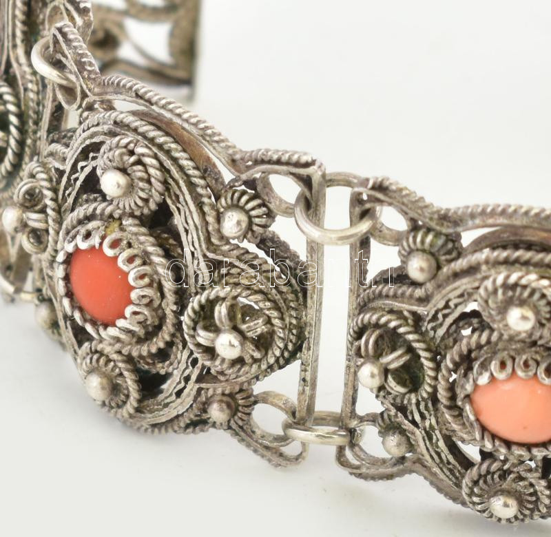 Ezüst (Ag) filigrán karkötő, csiszolt korall berakásokkal díszítve. Jelzés nélkül, bruttó: 47,9 g, h: 18,5 cm