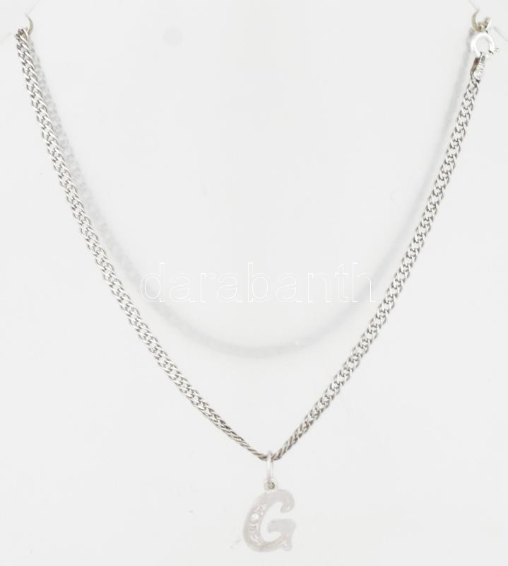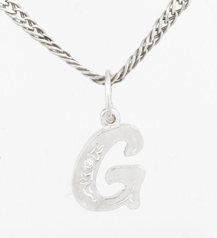 Ezüst(Ag) fonott nyaklánc köves "G" medállal, jelzett, h: 41 cm, 2,1×1 cm, bruttó: 5,5 g