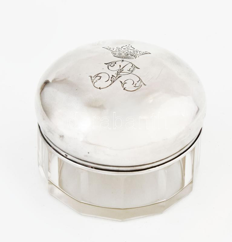 Ezüst(Ag) monogramos doboz, jelzett, üveg részén kopásnyomokkal, apró csorbákkal, d: 7,5 cm, bruttó: 143,3 g