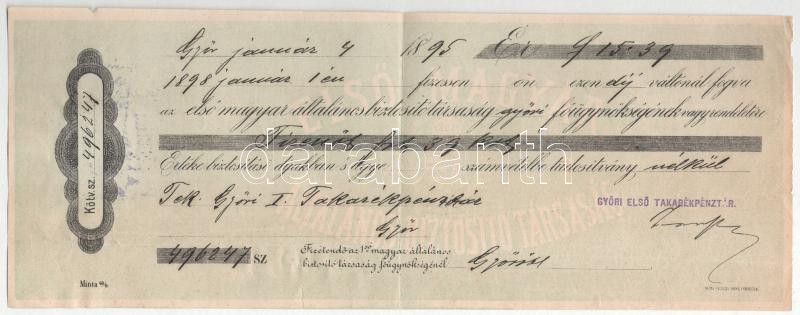 Description: Győr 1895. "Győri Első Takarékpénztár" kitöltött váltója az "Első Magyar Általános Biztosító Társaság" számára, "496247" sorszámmal, bélyegzéssel, illetékbélyeggel T:F kis szakadás