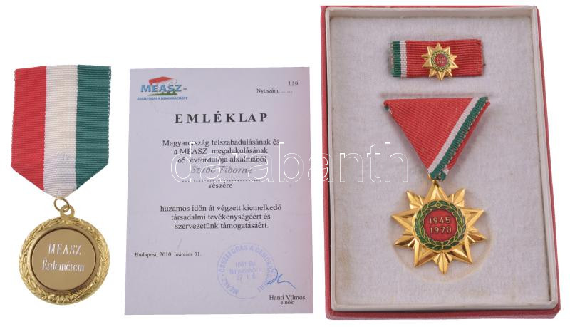 1970. "Felszabadulási Jubileumi Emlékérem" aranyozott, zománcozott bronz kitüntetés mellszalagon, miniatűrrel, szalagsávval, viselői igazolvánnyal, eredeti tokban + 2010. "MEASZ Érdemérem / A demokráciáért" fém érdemérem sérült mellszalaggal, adományozói emléklappal T:AU,XF