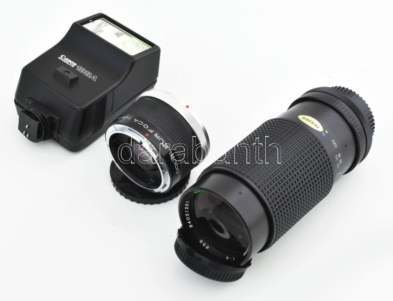 Canon AV1 fényképezpőgép 3 klf objektívvel, vakuval, egyéb tartozákokkal
