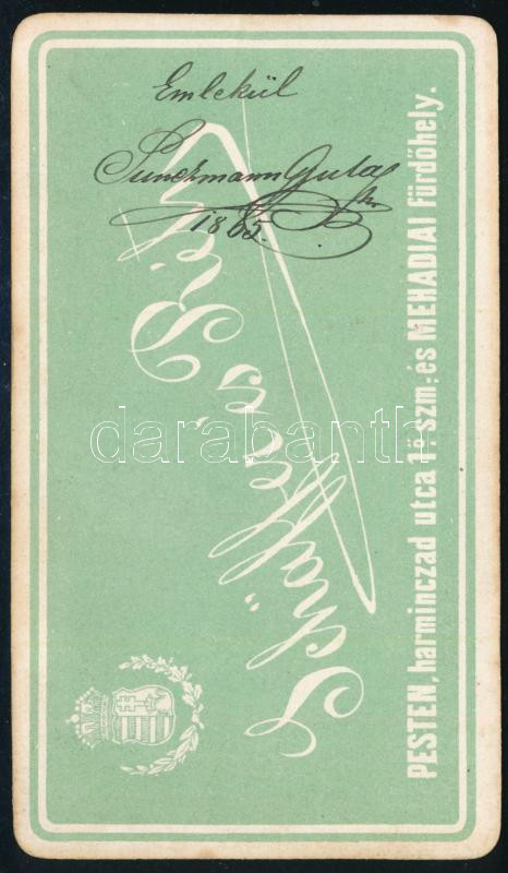 Description: 1865 Pártos Gyula (szül. Puntzman) (1845-1916) építész, a magyar szecesszió úttörőjének dedikált fotója (Punczmann Gyula néven írta alá), keményhátú vizitkártya Schäffer és Réty pesti műterméből, 10,5x6 cm