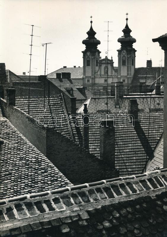 Description: 1971 Keveházi János (?-?) budapesti fotóművész pecsétjével jelzett vintage fotóművészeti alkotás (Háztetők), ezüst zselatinos fotópapíron; a kép a Népművelési Intézet által, Győrben megrendezett központi fotós alkotótelep (eredeti fotókat tartalmazó) albumából származik, 23,5x17 cm