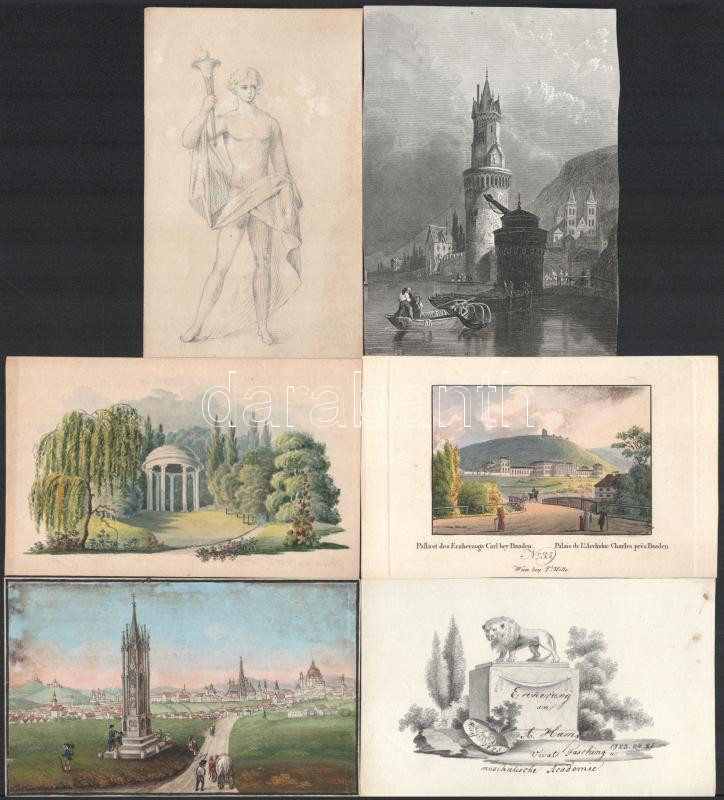 6 db XIX. századi grafikákról készült vegyes nyomat/metszet, részben j...