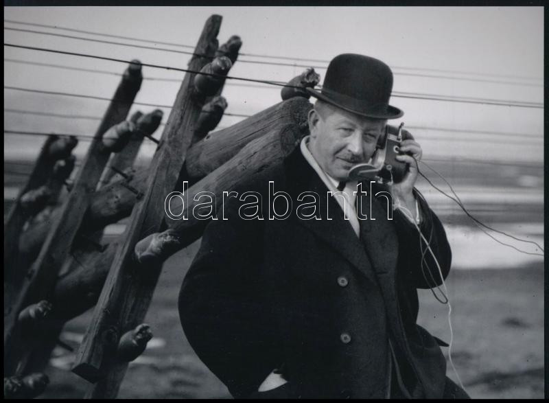 Description: cca 1932 Híradástechnikai mérnök korai ?mobil telefonja?, azaz bárhol csatlakozhatott a távíró és telefon vezetékekre, itt éppen a Velencei-tó partján, ahol viharkárokat mért fel, Kerny István (1879-1963) budapesti fotóművész hagyatékából 1. db modern nagyítás, jelzés nélkül, 15x21 cm