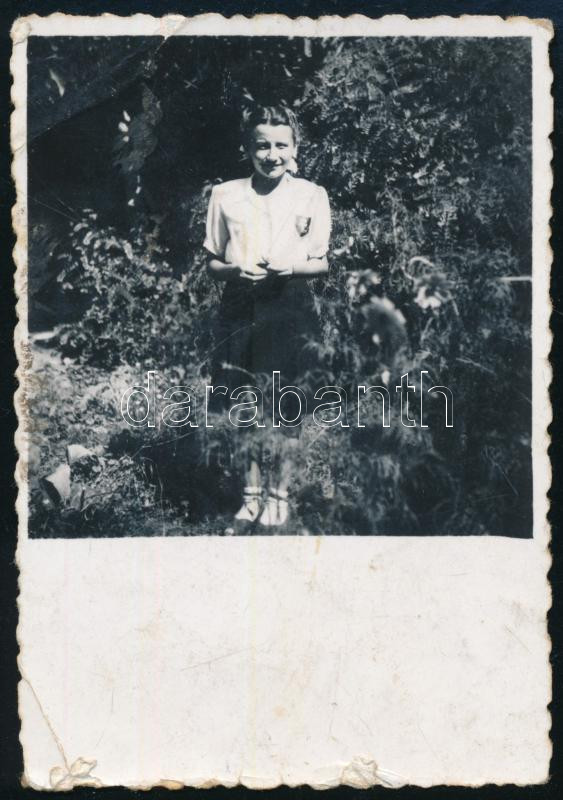 cca 1942 Lány levente fotója, felületén törésnyomok, 8×5,5 cm
