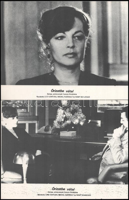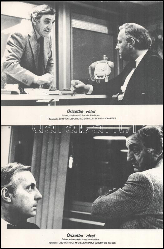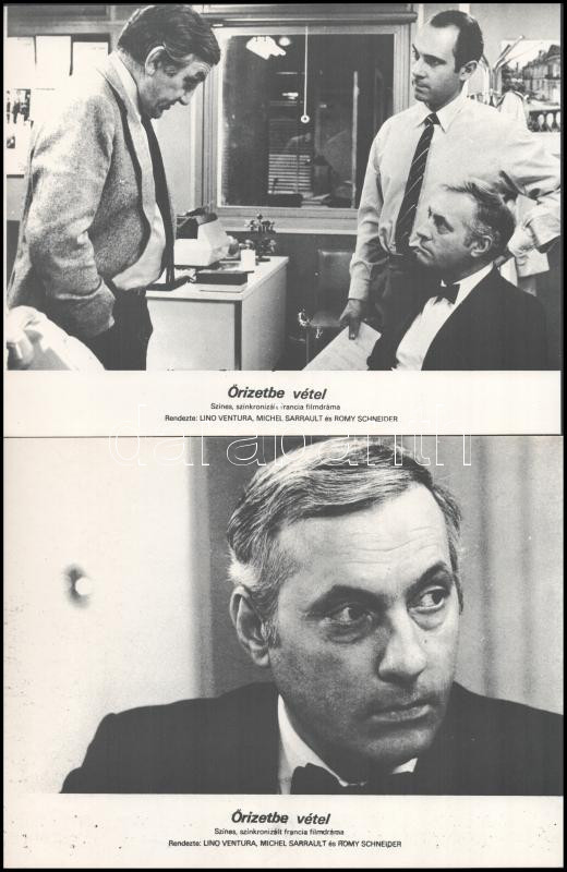Description: cca 1981 ,,Őrizetbe vétel" című francia filmdráma jelenetei és szereplői, 6 db produkciós filmfotó nyomdatechnikával sokszorosítva kartonpapírra, egyoldalas nyomással, a használatból eredő (esetleges) kisebb hibákkal, 18x24 cm
