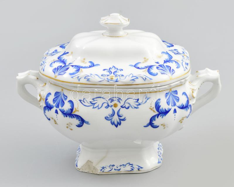 Bécsei fajansz kínáló edény, fedéllel. Kézzel festett, formaszámmal jelzett, sérüléssel 22x12 cm