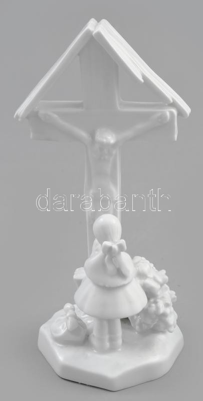 Herendi porcelán feszület előtt imádkozó lányka, fehér mázas, jelzett, hibátlan, m: 15 cm