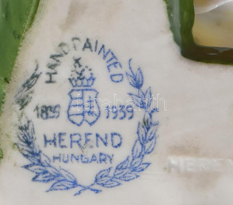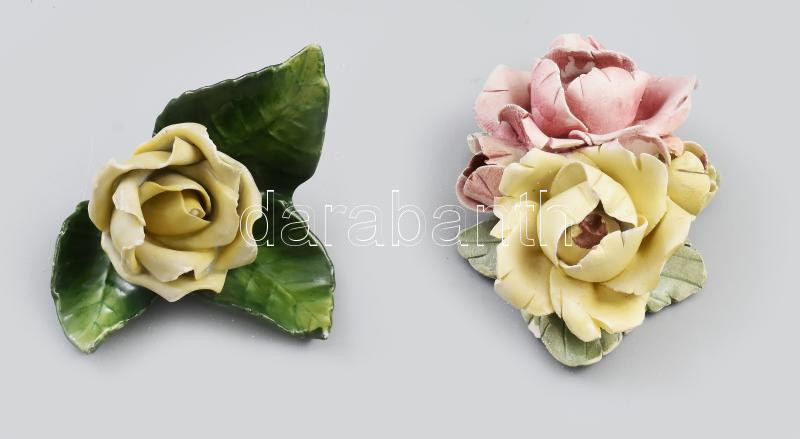 Herendi porcelán rózsa. Kézzel festett, jelzett (100 éves jubileum, 1939.), a levél szára sérült, 7x6x4,5 cm + Kézzel festett porcelán virág, jelzés nélkül, 8x5,5x3,5 cm