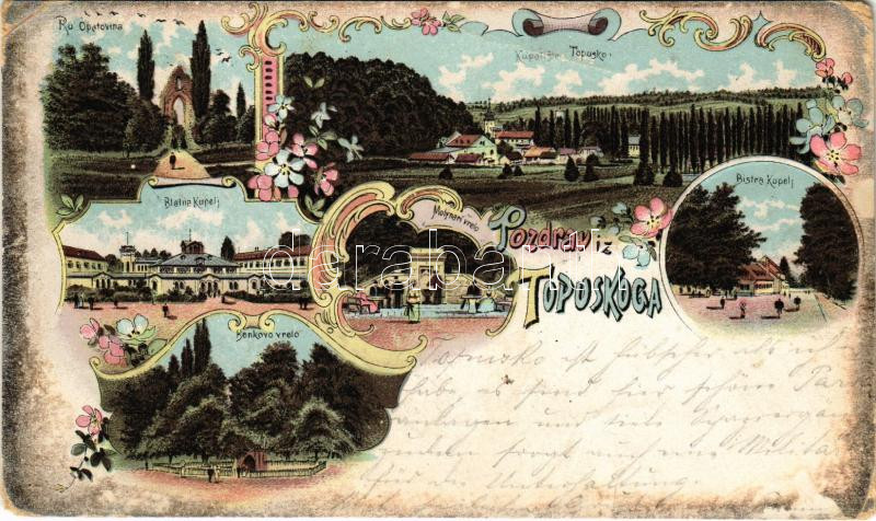 1901 Topuszka, Topusko; Ruine Opatovina, Blatna Kupelj, Molinary vrelo, Bistra Kupelj, Benko vrelo / spa, abbey ruins, mud bath, spring sources, baths. Art Nouveau, floral, litho (worn corners)