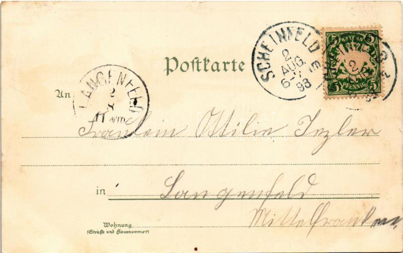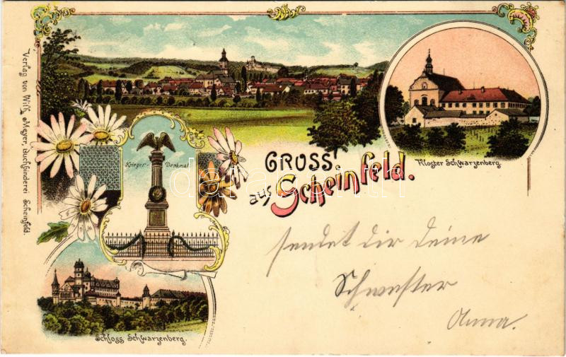 1898 (Vorläufer) Scheinfeld, Krieger-Denkmal, Kloster Schwarzenberg, Schloss Schwarzenberg. Art Nouveau, floral, litho (r)