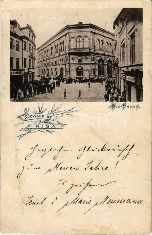 1897 (Vorläufer) Riga, Die Börse, Confiseur, Herren Garderobe / stock exchange, shops. M. Schulz Art Nouveau, floral (EK)