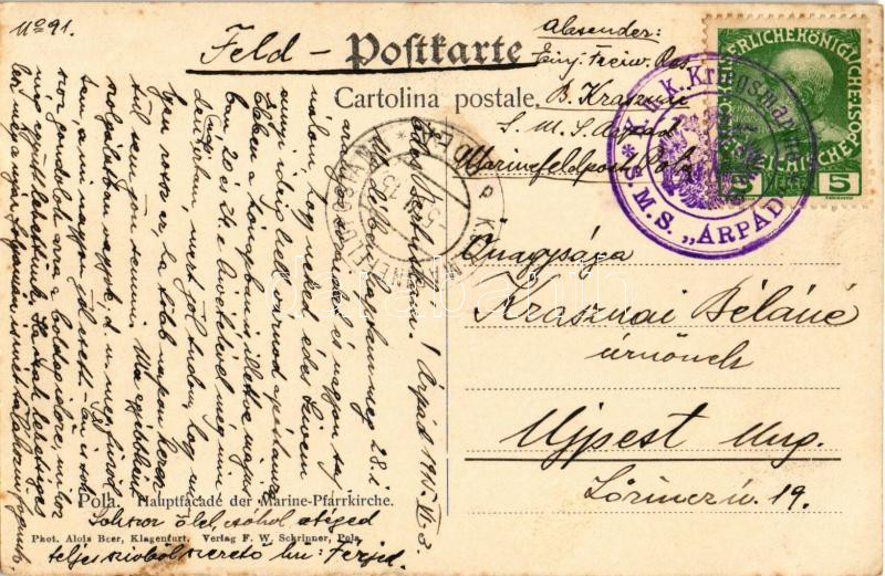 1915 Pola, Hauptfacade der K.u.k. Kriegsmarine Marine-Pfarrkirche. Phot. Alois Beer, F.W. Schrinner + "K.U.K. KRIEGSMARINE S.M.S. ÁRPÁD"