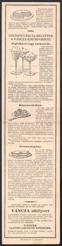 cca 1930 Váncza krémpor reklámlap receptekkel, Bp., Hungária-ny., kéto...