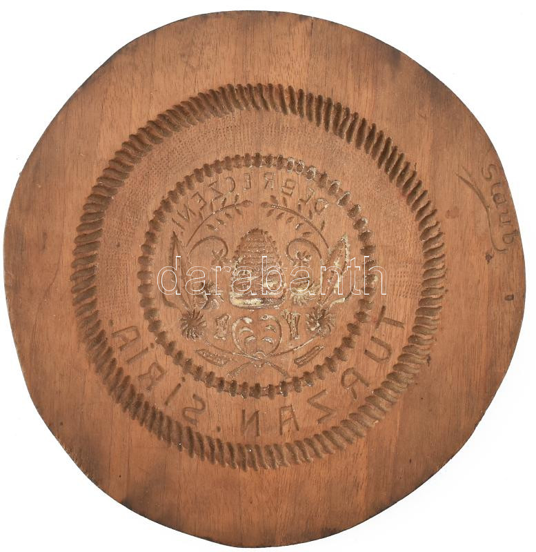 Antik fa sütemény nyomóforma, "Debreczeni Turzan Siria" felirattal, szignóval, korából adódóan kissé hullámos, de szép állapotban, jelzéssel, d: 22 cm