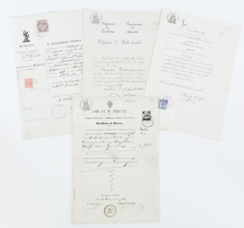 1877-1908 Olaszország, 4 db irat, okmánybélyegekkel, közte három vízjeles papíron