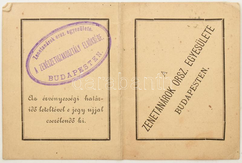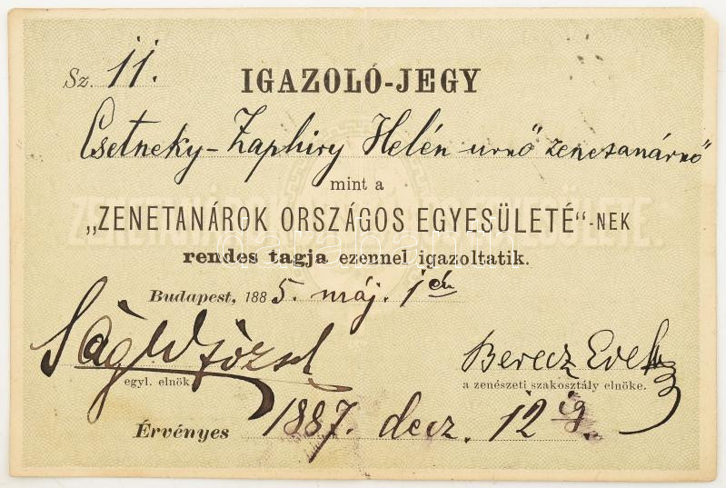 1887 csetneki Jelenik Zaphiry Helén (1860-1936) zongorista, Liszt Ferenc tanítványának igazoló jegye A zenetanárok Országos Egyesületébe.