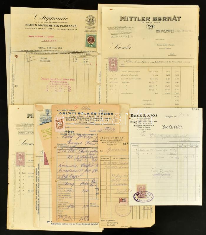 1906-1947 15 db fejléces számla (Hochsinger Testvérek ,,Uranos" vegyészeti gyár, Marx és Grossmann érckoporsó és ércárugyár, Mittler Bernát, stb.), vegyes állapotban, okmánybélyegekkel