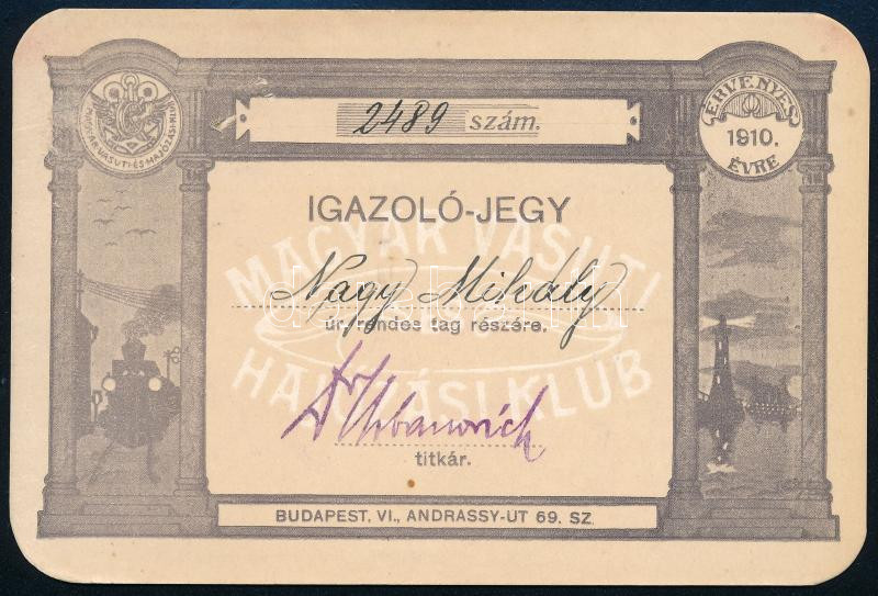 1910 Magyar Vasúti és Hajózási Klub (tagsági) igazolójegy, 11x7,5 cm