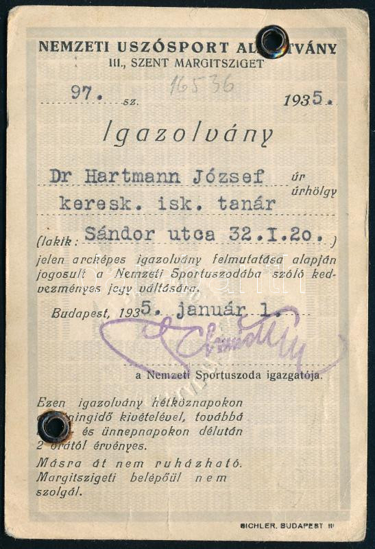1935 Nemzeti Sportuszoda fényképes igazolványa