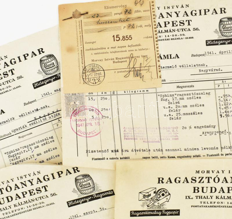 https://www.darabanth.com/en/448-Online-auction/448.0/Art-and-other-collectibles/Documents~1000031/1941-Morvay-Istvan-Ragasztoanyagipar-Bp-IX-Thaly-Kalman-u-56-4-db-fejleces-szamla-be~II2939779