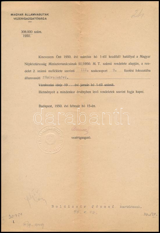 1950 Bp., MÁV kinevezési okirat (államvasúti főművezető), szárazbélyeg...