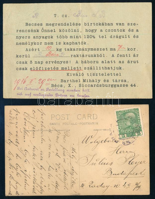 1916 Bécs, Barthel Mihály és Társa (vegyészszerek gyára) levelezőlapja üzleti témában + I. világháborús katonát ábrázoló fényképes levelezőlap, Prágából Budapestre küldve