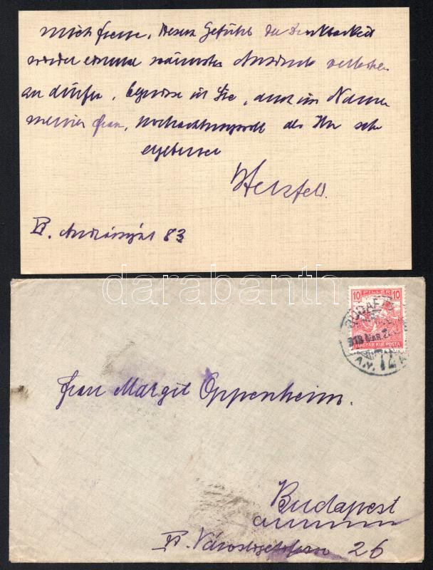 1918 Herzfeld Viktor (1856-1919) zeneszerzÅ‘, hegedűművész, karmester, zenekritikus, a budapesti Zeneakadémia tanárának német nyelvű autográf levelezÅ‘lapja, aláÃrással, Oppenheim Henrikné Schmidl Margit részére, borÃtékkal. + Hezfeld Viktor életérÅ‘l szóló fénymásolat.