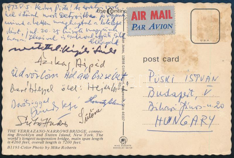 1973 Képeslap Amerikából Sütő András, Püski Sándor aláírásával