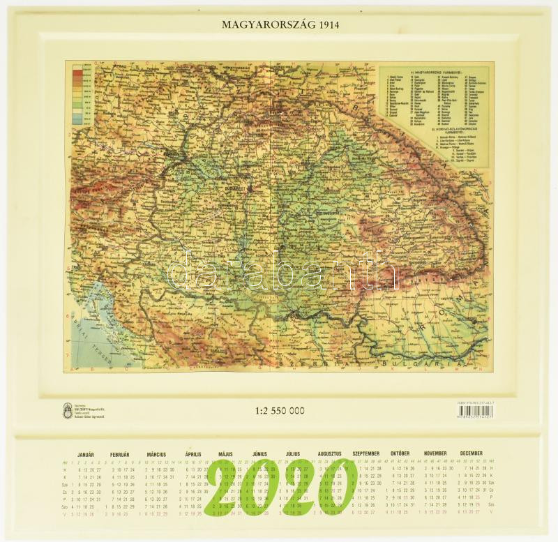 Magyarország 1914, 3D-s műanyag domborzati térkép, 1:2.550.000, a szélén 2020-as naptárral, Bp., HM Zrínyi Nonprofit Kft., jó állapotban, 50x52 cm