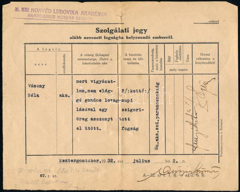 1932 M. kir Honvéd Ludovika Akadémia, akadémikus huszár század, szolgálati jegy fogságba helyezendő emberről, Vásony Béla (1910-1988) akadémikus fogoly, későbbi huszár őrnagy és százados elleni ítélet, M. kir Honvéd Ludovika Akadémia, akadémikus huszár század bélyegzővel, kissé sérült, 17x21 cm.