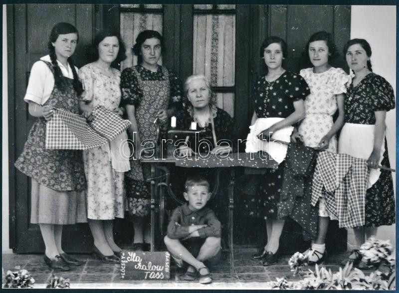 Description: cca 1934 Tass (Bács-Kiskun megye), Ila (varró) szalon tulajdonosa és alkalmazottjai, Lőcsei Árpád (?-?) kecskeméti vándorfényképész hagyatékából, eredeti üveglemez negatívról készült 1 db modern nagyítás, 15x21 cm