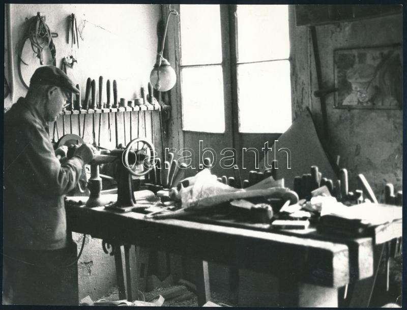 Description: cca 1975 Farjaszewski Zoltán nevével jelzett vintage fotó, amely Kiss Horváth Sándor műesztergályos műhelyében készült Budapesten, feliratozott fénykép, ezüst zselatinos fotópapíron, 18x23,8 cm