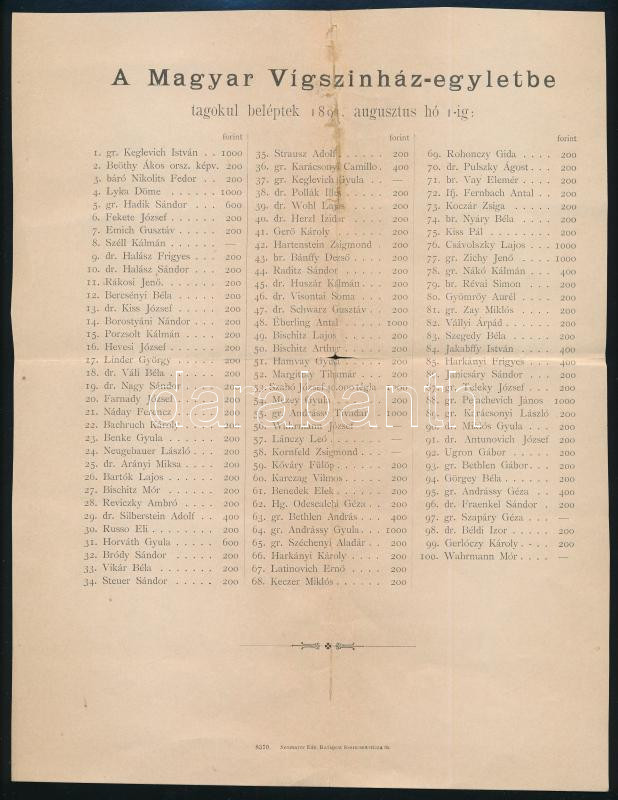 1891 A Magyar Vígszínház egyletbe belépett tagok 1891 augusztus hó 1-ig. Nyomtatvány, hajtásnyommal, ragasztva. Andrássy,.Pulszky, Rákosi, stb