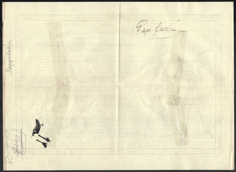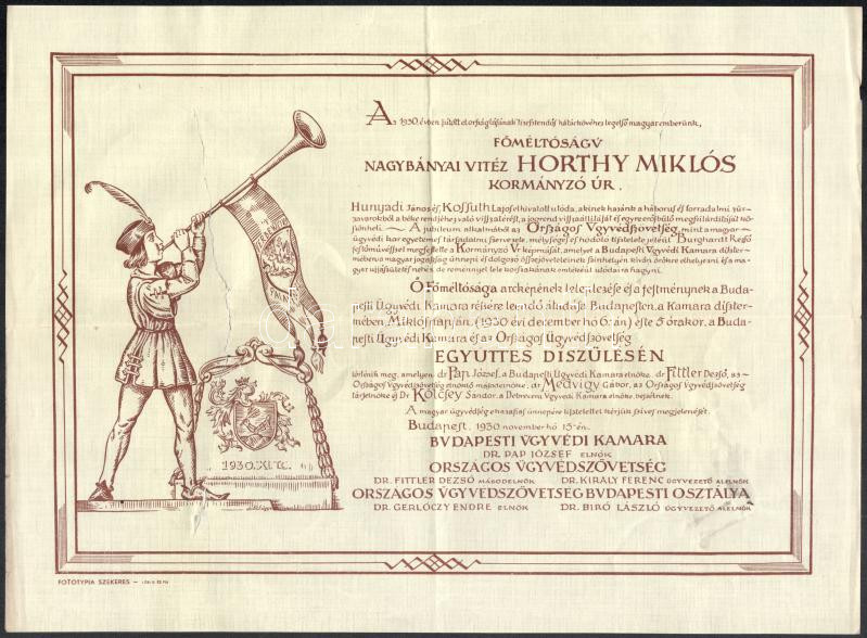 Description: 1930 Meghívó Horthy Miklós kormányzó arcképének leleplezésére és a festmény átadására a Budapesti Ügyvédi Kamara és az Országos Ügyvédszövetség együttes díszülésén. Hajtva, sérült, ragasztással javított, 29x21,5 cm