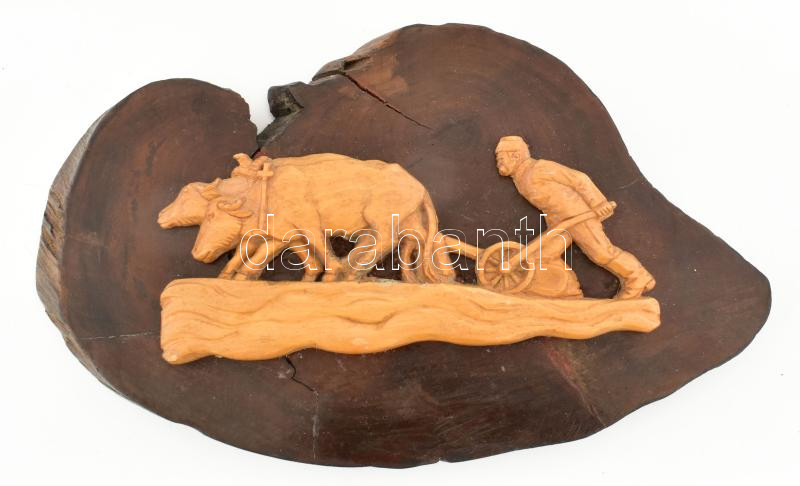 Csorvássy István (1912-1986): Ökrökkel szántó székely. Faragott fa falikép. Jelzett, hibátlan, h: 20,5 cm