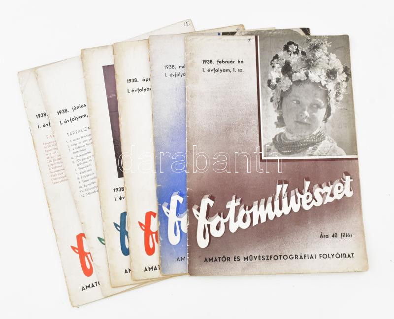 1938 Fotoművészet. Amatőr és művészfotográfiai folyóirat. 6 db szám: I. évf. 1. (induló szám), 2-5., 11. sz., 1938. február-december. Fekete-fehér fotókkal, hirdetésekkel. Tűzött papírkötés, vegyes állapotban.