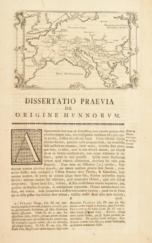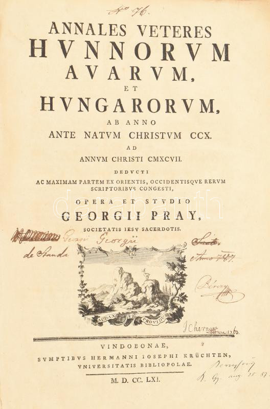 Pray [György], Georgius: Annales Veteres Hunnorum, Avarum, et Hungarorum, ab anno ante natum Christum CCX. ad annum Christi CMXCVII. Deducti ac maximam partem ex orientis, occidentisque rerum scriptoribus congesti, opera et studio Georgii Pray. [Bécs] Vindobonae, 1761. Sumptibus Hermanni Iosephi Krüchten. [8] + 368 A jezsuita szerzetes Pray György a XVIII. századi magyar történetírás egyik kiemelkedő alakja, munkája az addig ismert magyar őstörténeti források összefoglalása. Az író e művében a hun-magyar-avar folytonosság hagyományos elméletét. 3 szövegközti térképpel, a kihajtható térkép melléklet hiányzik. Koprabeli, erősen sérült egészbőr kötésben. Folio