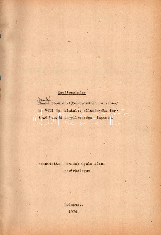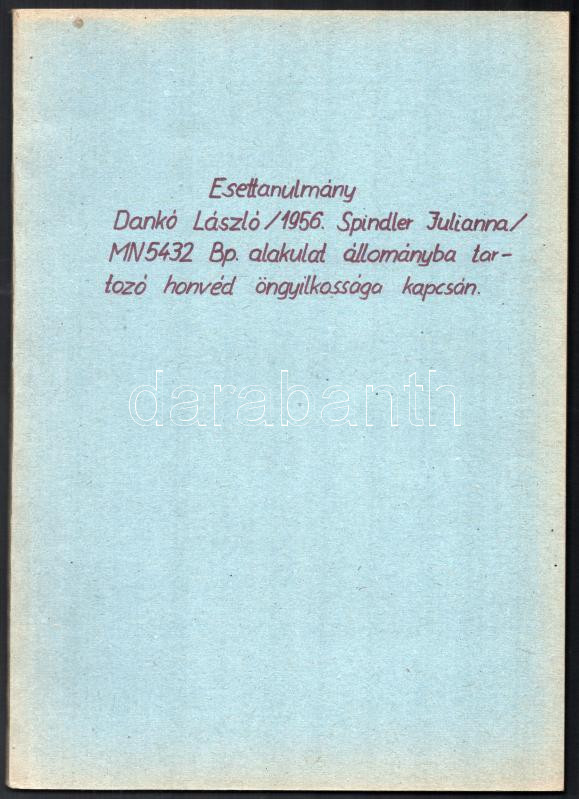 Benedek Gyula: Esettanulmány Dankó László /1956. Spindler Julianna/ MN 5432 Bp. alakulat állományába tartozó honvéd öngyilkossága kapcsán. Bp., 1976, k.n., 36 p. Kiadói papírkötés, ceruzás aláhúzásokkal és javításokkal.
