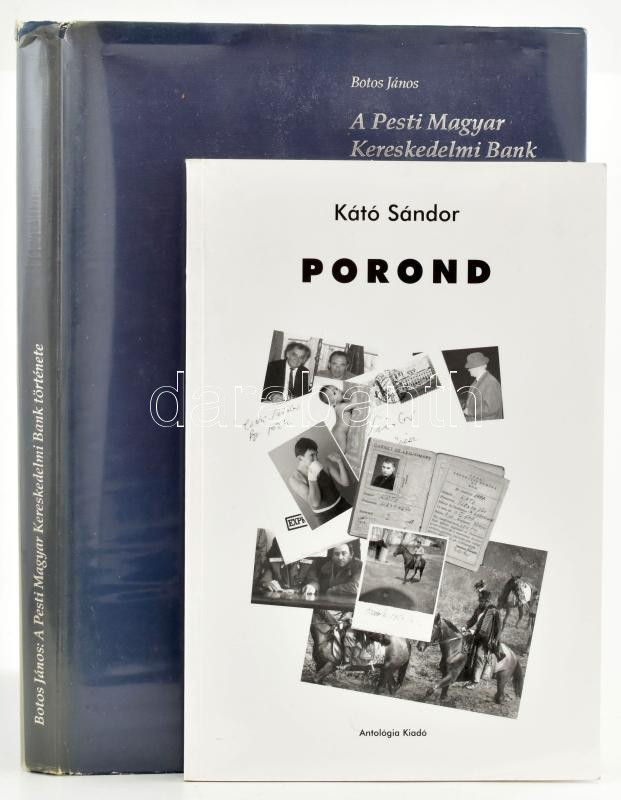 Description: 2 db szerző által aláírt/dedikált könyv: Botos János: A Pesti Magyar Kereskedelmi Bank története. Bp.,1991, Kereskedelmi Bank Rt. Kiadói kartonált papírkötés, kissé sérült műanyag védőborítóban. A szerző által aláírt példány. Kereskedelmi forgalomba nem került. + Kátó Sándor: Porond. Lakitelek, 1999, Antológia Kiadó. A szerző által DEDIKÁLT.