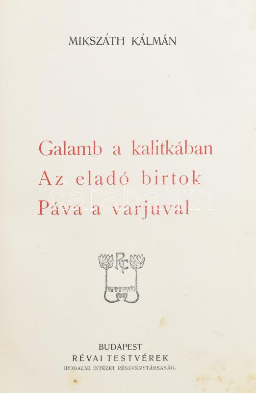 Mikszáth Kálmán: Galamb a kalitkában, Az eladó birtok, Páva a varjúval... https://www.darabanth.com/en/448-Online-auction/448.0/Books/Books-Other-rarities~2000024/Mikszath-Kalman-Galamb-a-kalitkaban-Az-elado-birtok-Pava-a-varjuval-Bp-Revai-Kiadoi-~II2869800